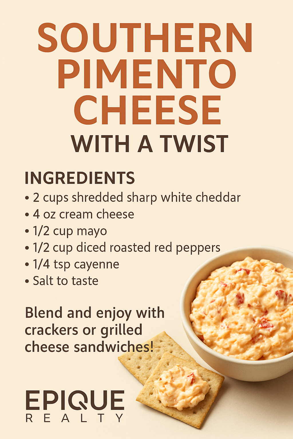 Real estate may be my career, but great food is one of my favorite ways to unwind—and nothing says Southern comfort quite like pimento cheese. Whether I’m hosting an open house, enjoying a sunny Upstate SC afternoon, or just settling in for a cozy night, this recipe is always a hit. It’s rich, tangy, and has just enough kick to keep things interesting.